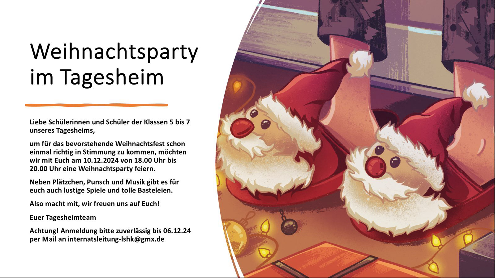 Im weihnachtlich geschmückten Speisesaal ging unsere Tagesheim-Weihnachtsparty los mit Spekulatius und Kinderpunsch. Noch im Speisesaal erfolgte die Einteilung in 4 Gruppen, die im weiteren Verlauf vier Stationen durchlaufen konnten: