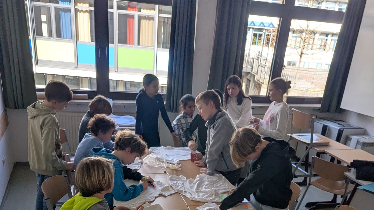 Bei sonnigem Wetter konnten die Kids der 5. Klassen unseres Tagesheims nach dem Mittagessen T-Shirts bemalen. Um die selbst mitgebrachten Shirts zu gestalten, hatten sie viele bunte Textilstifte und Fingerfarben zur Auswahl und konnten somit ihrer Kreativität freien Lauf lassen.