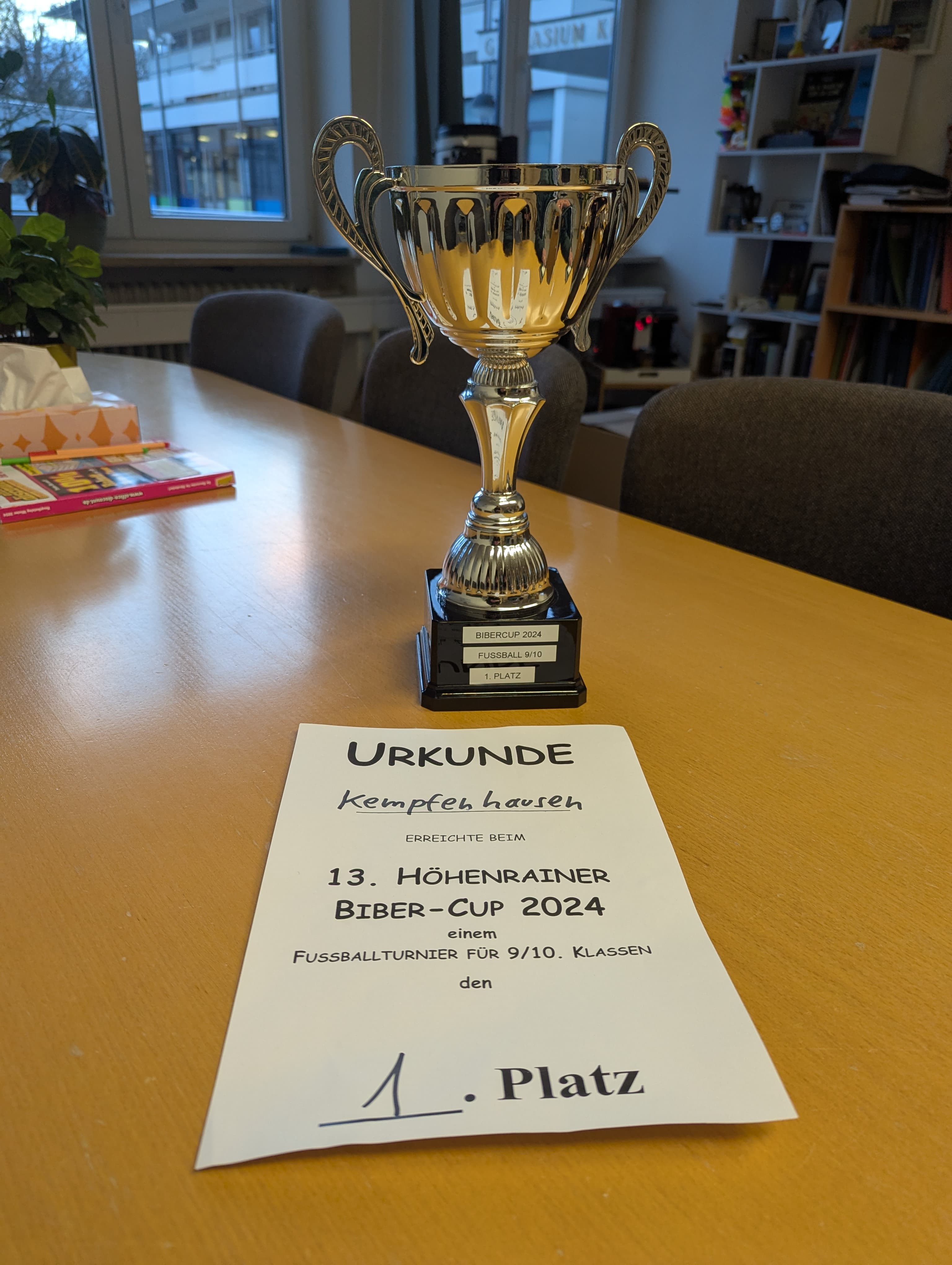 Zum Schluss waren die 9. und 10. Klassen dran. Im Modus "Jeder gegen Jeden" verloren wir das erste Spiel knapp gegen Kaufering, nach einer Großzahl vergebener Chancen. Im Anschluss konnten wir jedoch jedes weitere Spiel gewinnen und als Erster verdientermaßen den von Kaufering gesponsorten Pokal entgegennehmen.