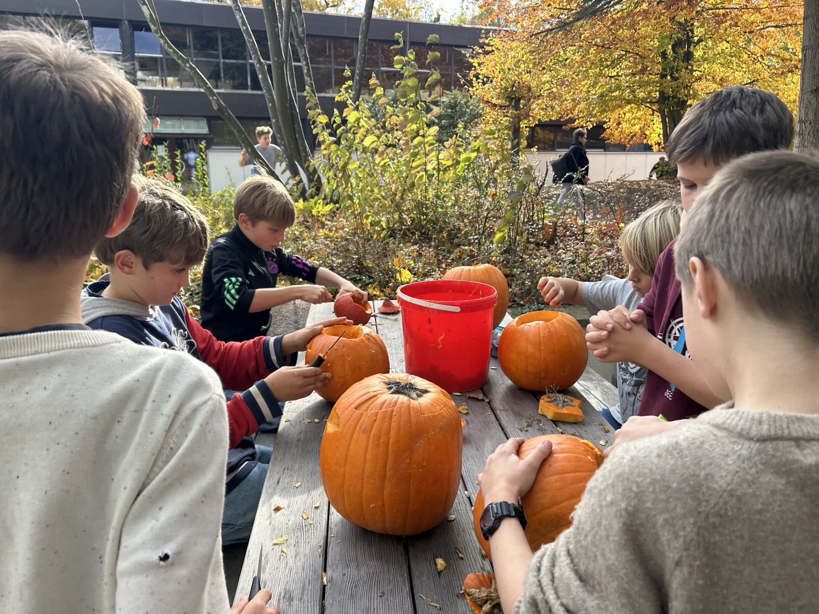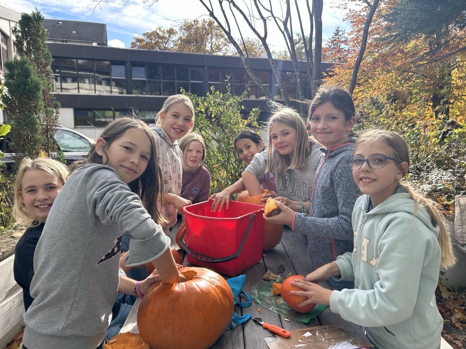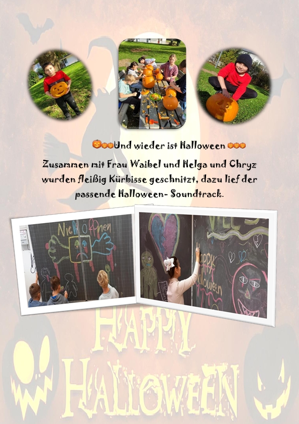 Am Donnerstag vor Halloween traf man im Tagesheim kleine und große gruselige Gestalten, die sich sowohl beim Maskieren und Kostümieren wie auch beim Kürbis schnitzen mächtig ins Zeug legten.