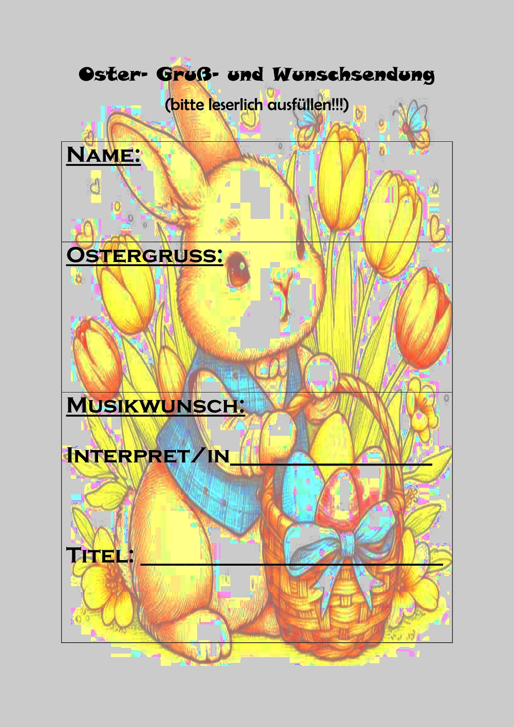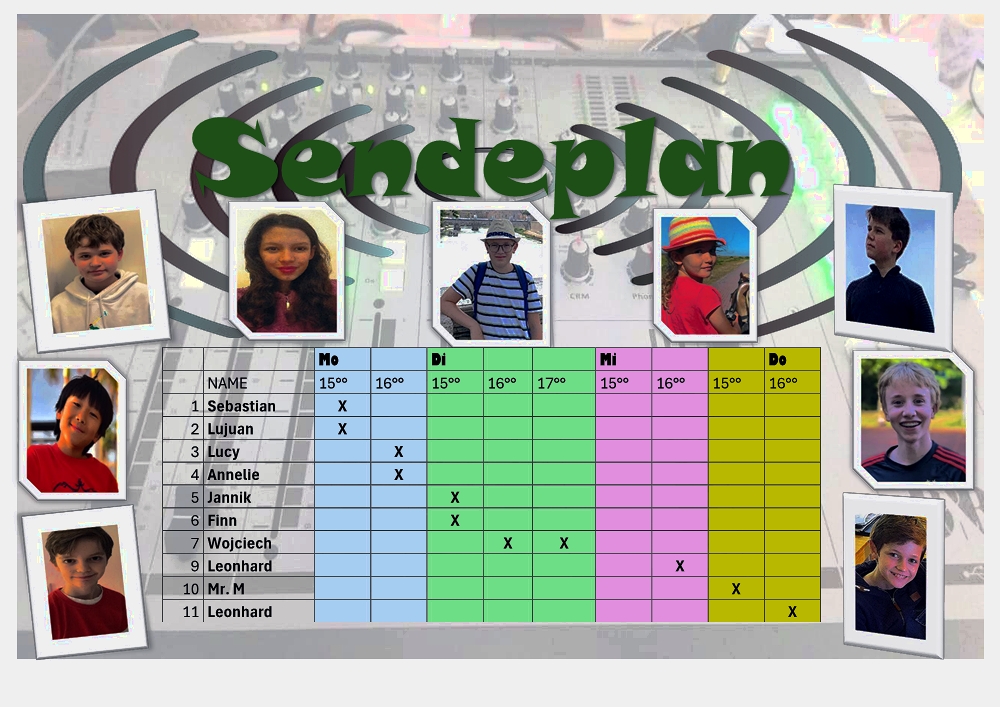 Da fand die erste Ostergruß- und Wunschsendung unserer Radio-AG auf Radio Geretsried statt. Wer Ostergrüße oder Musikwünsche erfüllt haben wollte, hatte die Möglichkeit, uns diese am Tag der offenen Tür schriftlich per Wunschzettel oder per Sprachnachricht mitzuteilen. Diese wurden dann am Ostersonntag von 12:00 bis 18:00 Uhr ausgestrahlt. Insgesamt haben 65 Zuhörerinnen und Zuhörer daran teilgenommen, wodurch die Musikplanung gesichert war. Das Verlesen der Grüße und Wünsche übernahm das Moderationsteam. Alle Wünsche konnten erfüllt werden.