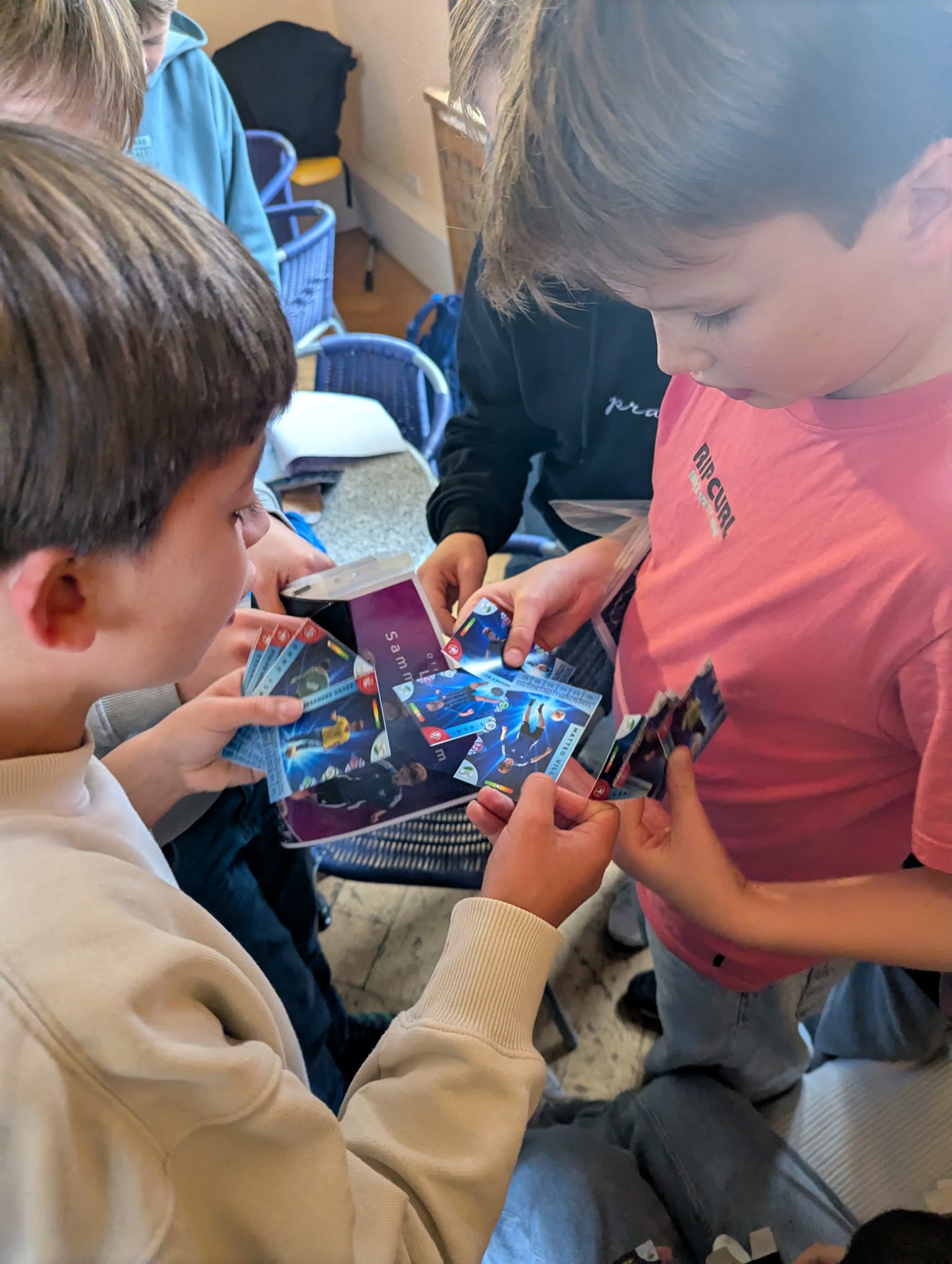 Kurz nach den Ferien müssen die produzierten Karten nur noch in die entsprechenden Packs verpackt werden und wandern dann weiter in die Candybar, wo sie die Kinder dann kaufen, tauschen und sammeln können!