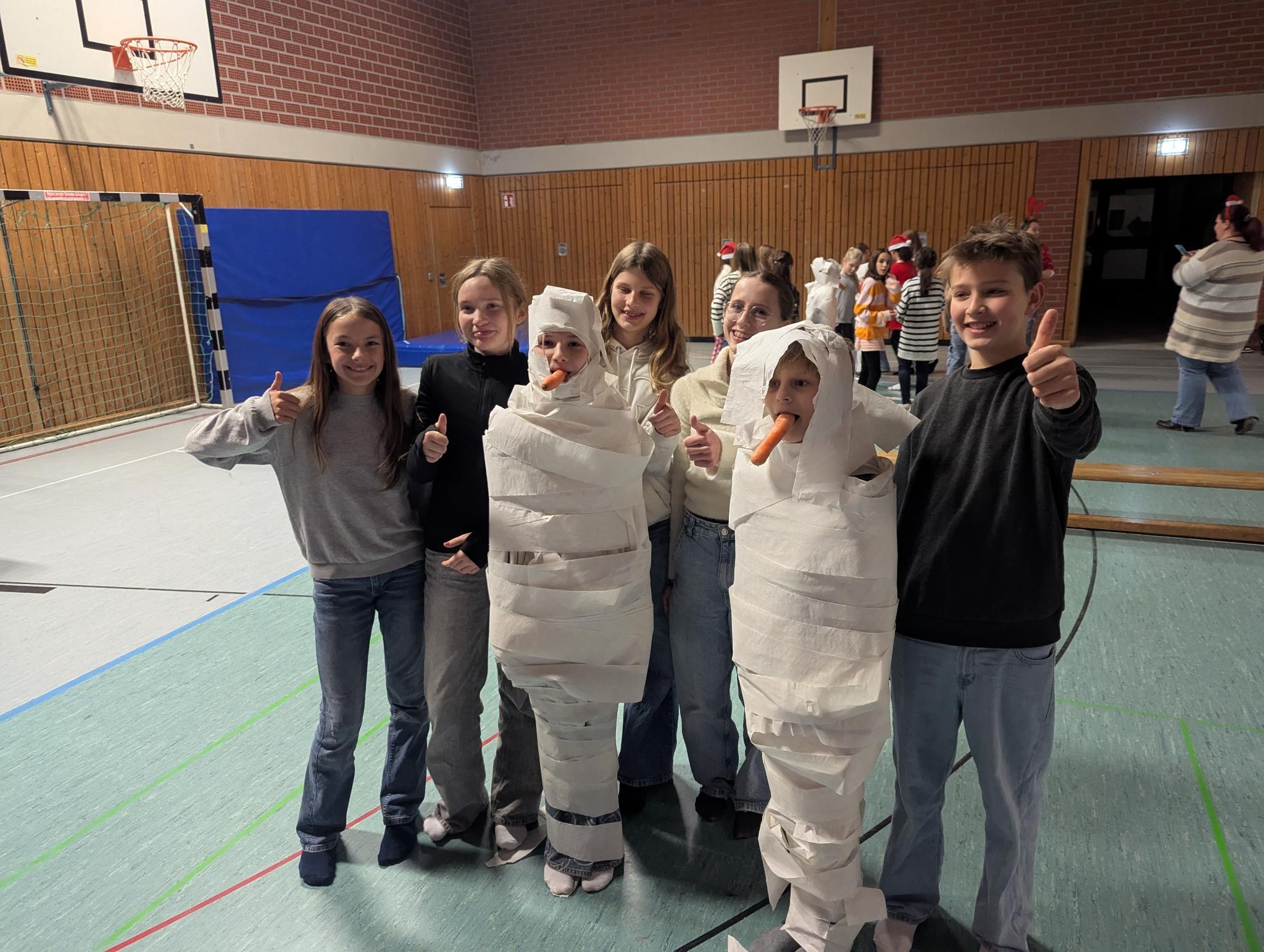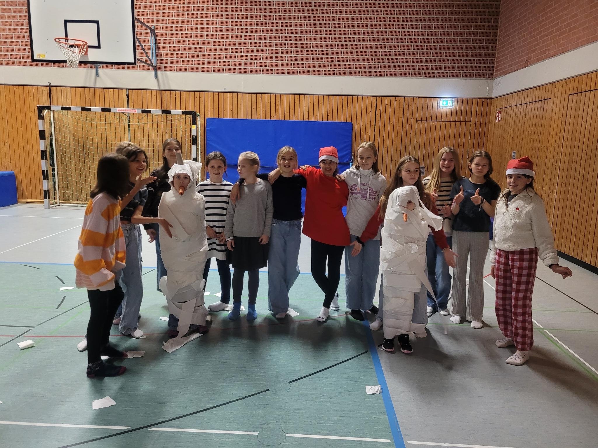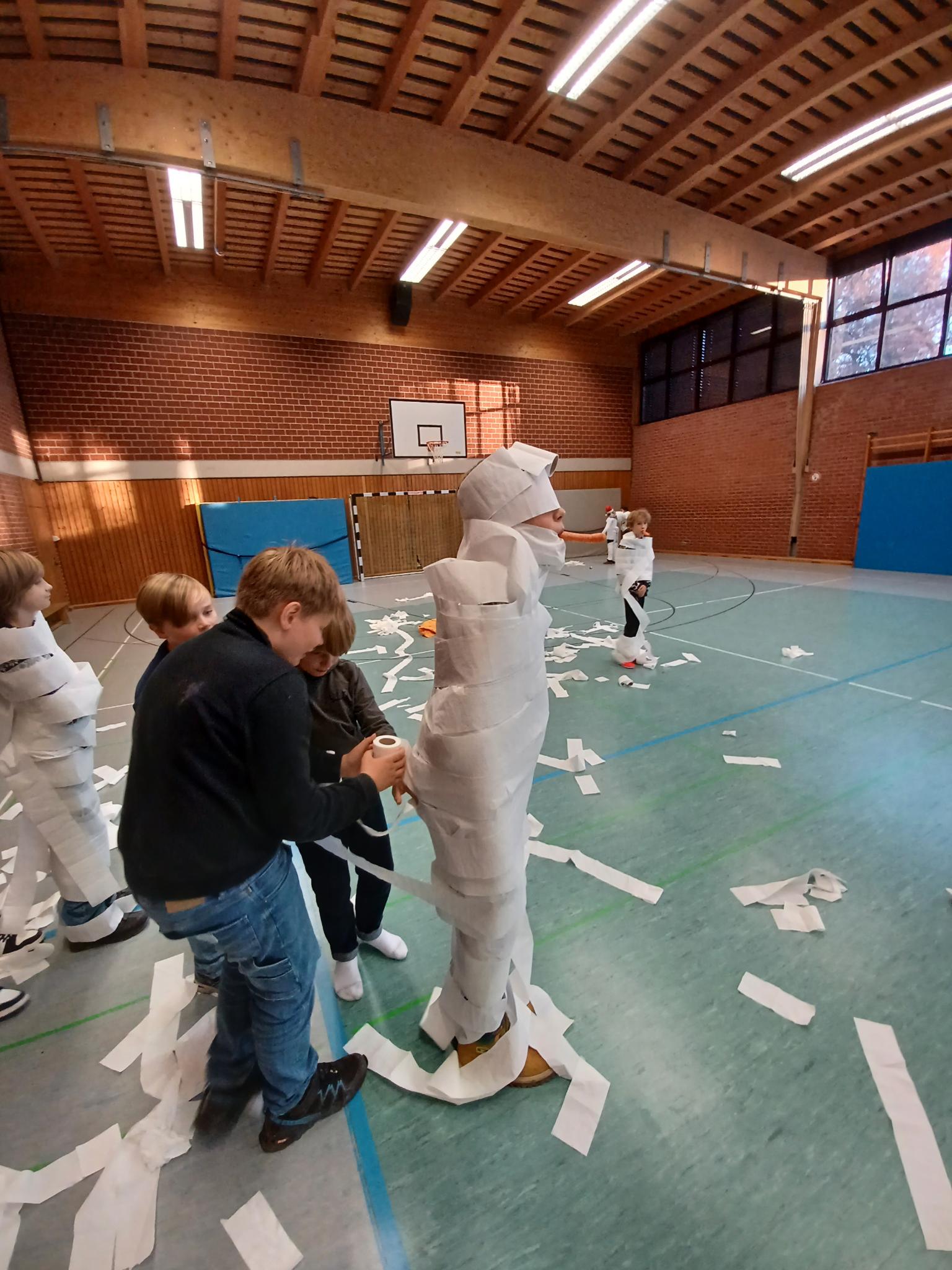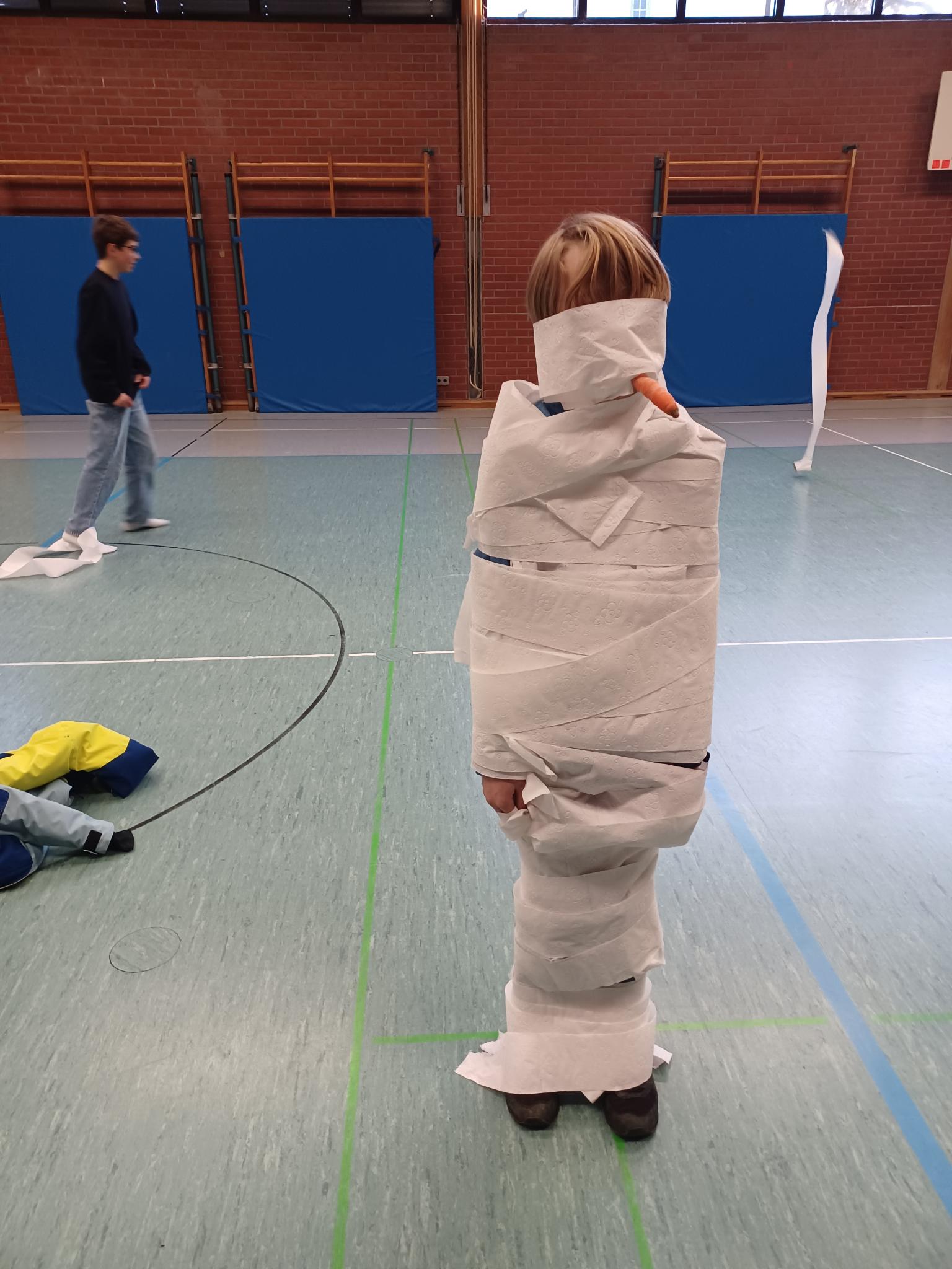 Da leider noch kein Schnee zur Verfügung stand, durften die Kinder sich gegenseitig in Schneemänner verwandeln mithilfe von Karotten und Klopapier.